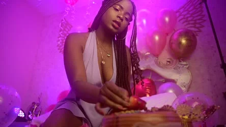 «La habitación está llena de luz morada y globos plateados, todo para mi celebración especial. Guardé este vestido blanco solo para esta noche, solo para ti. No puedo dejar de sonreír mientras bailo, sintiendo la música moverse a través de mí. Lanzo los globos al aire, imaginando que estás aquí conmigo, atrapándolos. Mi cuerpo se siente tan vivo con este vestido y me encanta cómo se mueve conmigo. Me doy la vuelta lentamente, queriendo que veas cada parte de mí. ¿Qué piensas? Quizás podamos crear nuestros propios fuegos artificiales.»